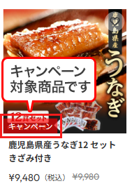 商品画像左下にキャンペーンのタグが付いているものがキャンペーン中の商品です。